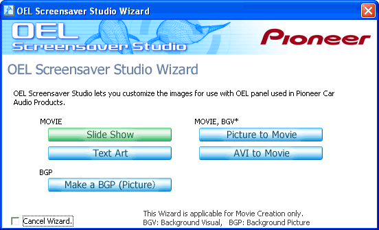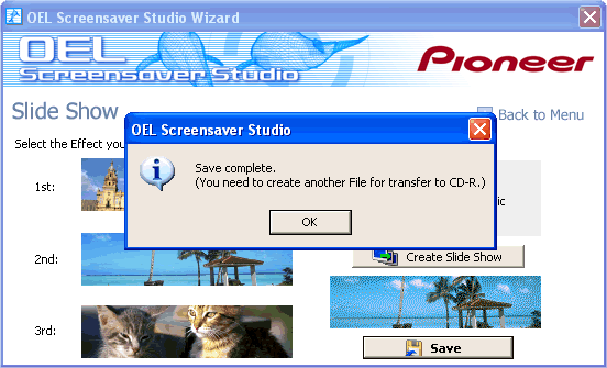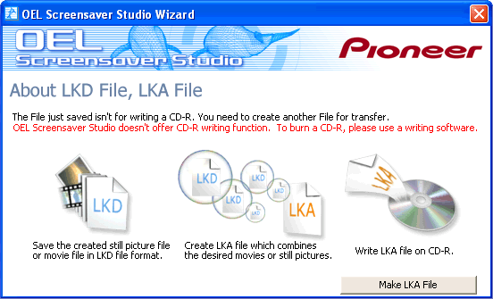 ![]() When you click on No and you finish editing in the wizard, an explanation of the LKD file and LKA file appears. An LKD file is a file format for use in OEL Screensaver Studio and an LKA file is used to organize LKD files when sending them to your car audio. When you actually send LKA files to your car audio you must write them to a CD. OEL Screensaver Studio does not contain a CD writing function. Use commercial CD writing software. |