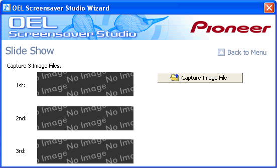 ![]() Once you have clicked the Capture button, the wizard screen appears and the image that is cut out with the specified frames displays in the left side of the screen in the First Image area. This is the first image of the Slide Show. You can also use this method to capture the second and third images of the Slide Show. 6