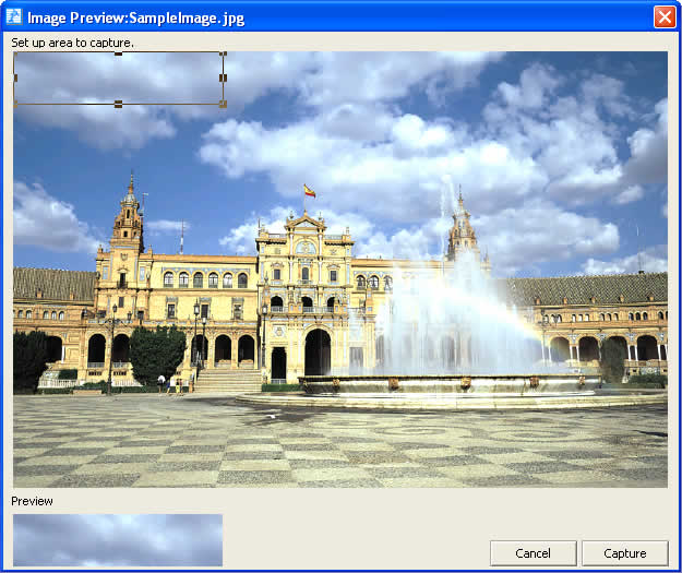 ![]() When you have selected the image, this preview screen appears. Partition the area you would like to use with frames in this screen. When you click inside and drag these frames you can move them. Additionally, when you click on one of the four corners or near the center, you can enlarge or shrink the frame. When you drag the frames while pressing Shift, all of the frame sides will enlarge or shrink equally. A preview of the cut out is generated at the lower left of the screen. Refer to this preview while adjusting the frame position and size. Place a frame around the area you would like to cut out and click the Capture button. 5