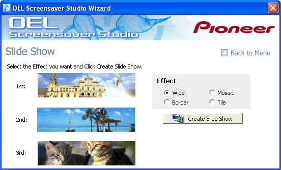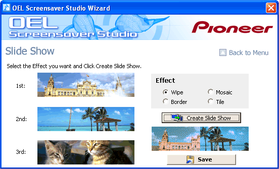 ![]() When you capture all three images, the buttons Select Effect and Make a Slide Show appear on the right side. You can now select the effect you will use when the Slide Show images change. Select the effect you find most pleasing. When you have select this, click on Make a Slide Show. 7