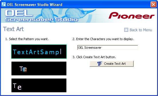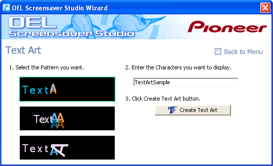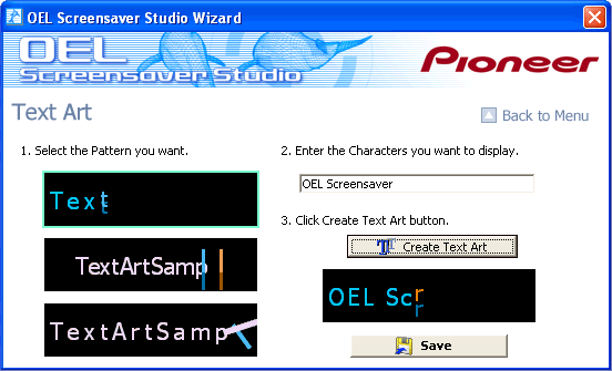 ![]() When the pattern selection and text inputting is complete click Text Art. The text art will be created and displayed. When you wish to select another pattern or change the text, re-select/re-input the text and click Text Art. This completes the text art creation process. Click on Save. 6