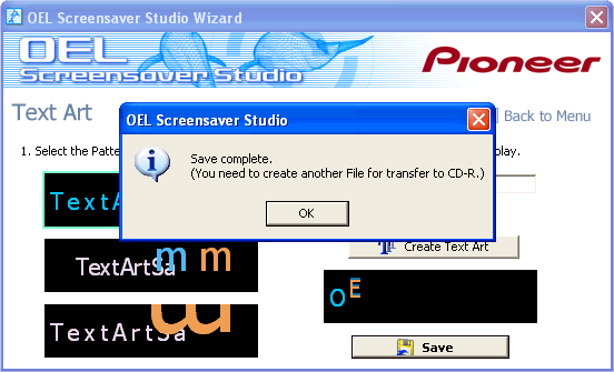 ![]() When you click on No and you finish editing in the wizard, an explanation of the LKD file and LKA file appears. An LKD file is a file format for use in OEL Screensaver Studio and an LKA file is used to organize LKD files when sending them to your car audio. When you actually send LKA files to your car audio you must write them to a CD. OEL Screensaver Studio does not contain a CD writing function. Use commercial CD writing software. |