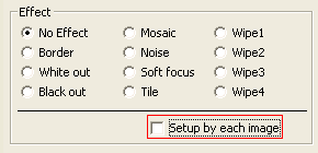 ![]() When you have finished capturing the images, select the effect that you desire to have when switching images in the Slide Show. The effects are usually the same for all picture, however you can also specify different effects for each picture. To change this setting use the click box under Switch for Each Picture in Effect. 6